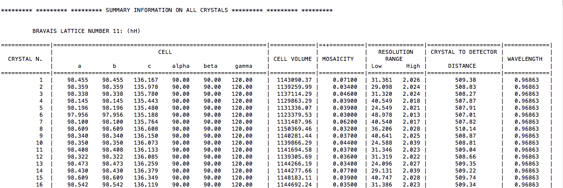 LCV and aLCV values have slightly changed because some of the clusters have also changed slightly. But the range is within acceptable values, as far as isomorphism is concerned. The most noticeable feature of this dendrogram is that it is split into two branches having, more or less, the same number of individual data sets. We can, therefore, proceed to run BLEND in synthesis mode, limiting resolution to an acceptable value. This can be inferred from the file "FINAL_list_of_datasets.dat", the top part of which is displayed here: