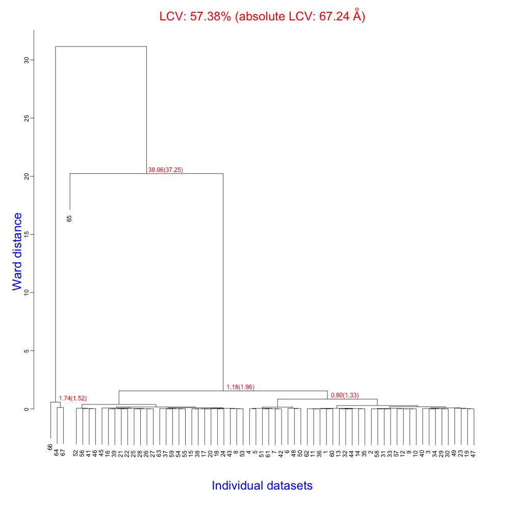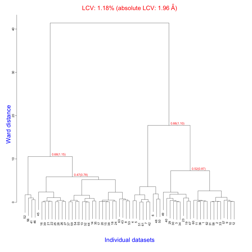 Clusters 60 and 61 are associated with the two main branches of the dendrogram. The crystals composing them have a good degree of isomorphism because the aLCV values for them are 1.15 Å and 1.10 Å, respectively. But the completeness for cluster 61 is quite low. Therefore we will have to use cluster 60 to assemble a complete data set.