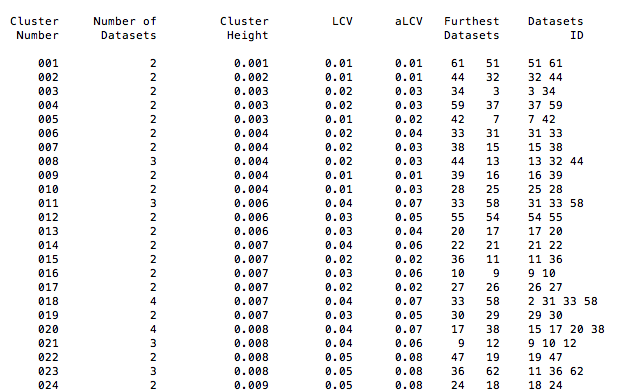 The ASCII version of this dendrogram is given in file "CLUSTERS.dat", whose top part looks like the following: