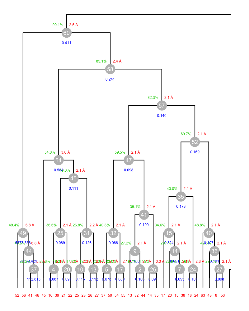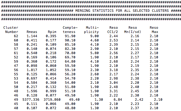 Although this annotated dendrogram looks cluttered because too many nodes are displayed, you should be able to see that all clusters at the bottom have reasonable values of Rmeas, but cluster 49. How can cluster 49 be improved? The same goes for clusters 54 and 58. Eventually, will the improvements on these clusters have effect on cluster 60?