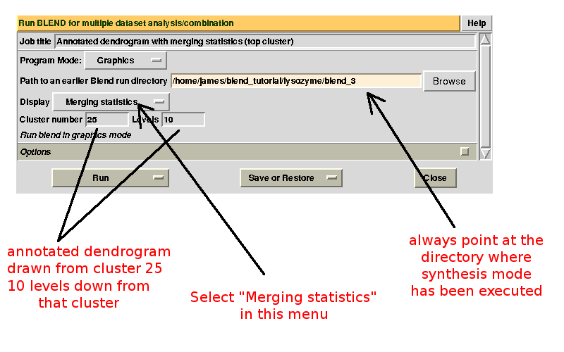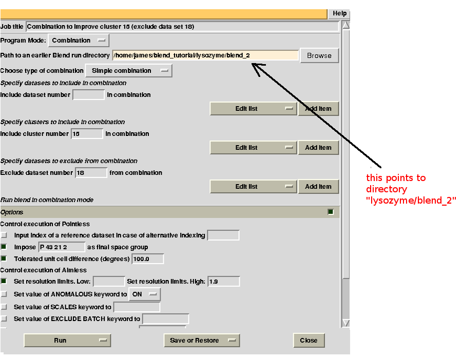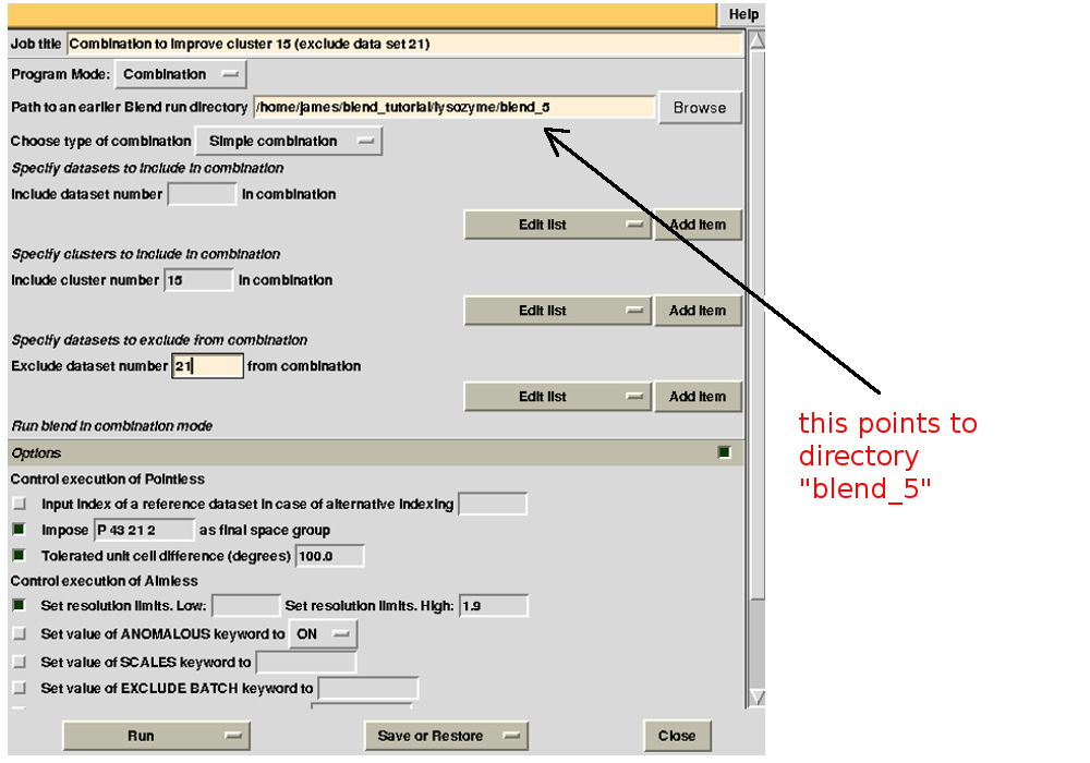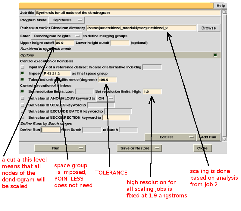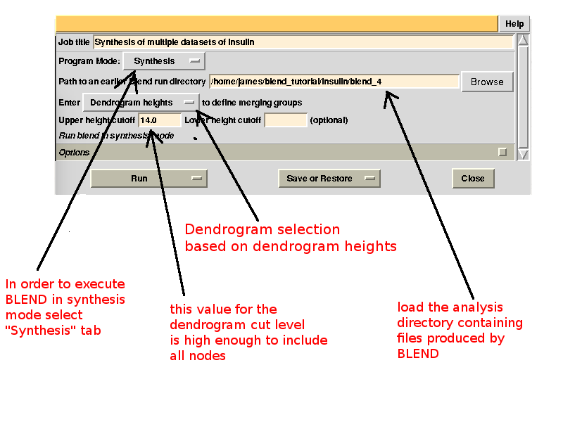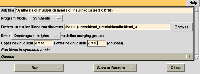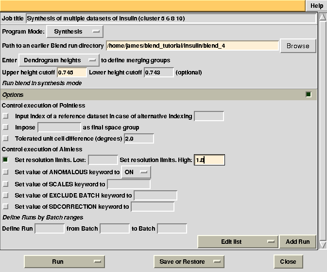 Cluster numbers and corresponding data sets are listed in column 1 and column 6 respectively. The second column reports how many data sets form the specific cluster, while in column 3 it is found the exact height at which data sets merge to form the cluster. Columns 4 and 5 lists all LCV and aLCV values. The dendrogram encourages people to look for grouping of individual data sets. Larger groups attract one's attention more than smaller groups. In this sense the presence of two clusters, cluster (1 2 3 4 14) and cluster (5 6 7 8 9 10 11 12 13), is immediately perceived. Very soon, though, we realise that the second cluster is made up of two smaller clusters, cluster (5 6 8 10) and cluster (7 9 11 12 13). Finer details and even smaller clusters can be singled out by proceeding to the lower part of the dendrogram. This way of proceeding through the dendrogram interpretation can have some validity, but is highly subjective. In BLEND it is found that a more logical, straightforward and objective way of interpreting the dendrogram is to assume that each node can represent a valid data set. Subsequent operations of space group assignment (POINTLESS) and scaling (AIMLESS) determine the degree of validity. This interpretation is accomplished with BLEND synthesis execution mode. From “CLUSTERS.txt” we read that everything merges at height 13.670. If the user wishes to produce results for all nodes under a certain height, it will suffice to specify this in the GUI. For instance, to produce results for all nodes in the insulin example, the BLEND section of the GUI will look like this: