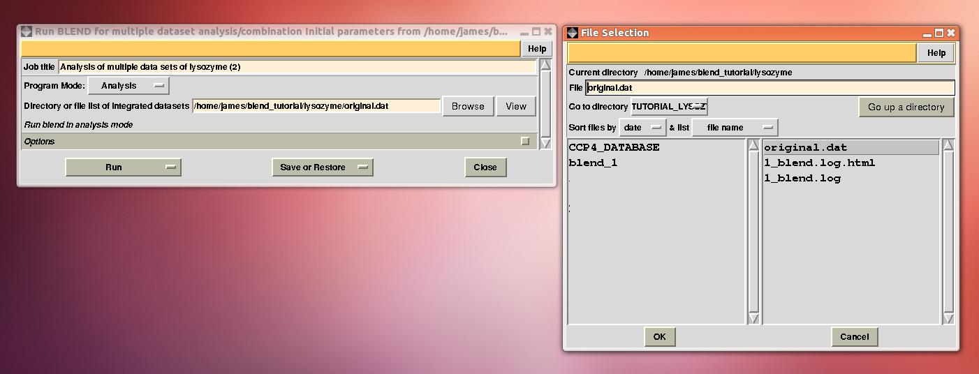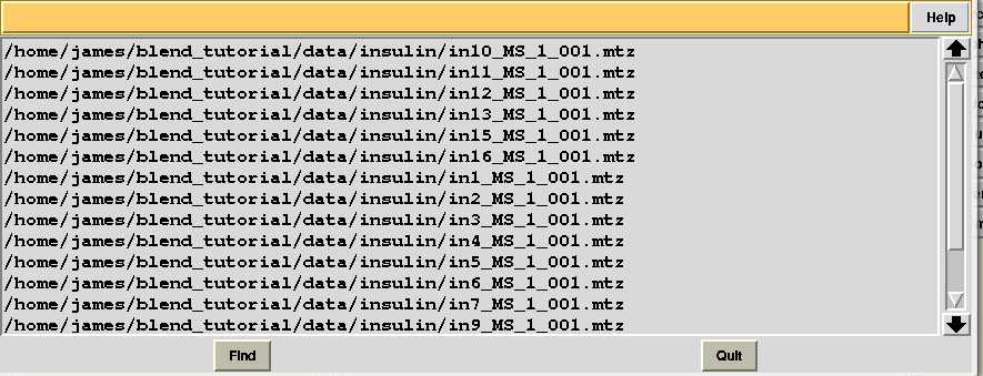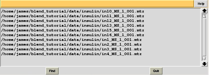 For convenience all tutorials can be carried out inside a same directory and specific results can be collected in separate sub-directories. We will assume that "blend_tutorial" is the name of the overall directory and that it has been created in the $HOME area ("/home/james" in our case). Different directory names and locations can be used, but appropriate modifications will have to be applied to the paths displayed in this document. Data downloaded using the above links, when unpacked, yield a directory named "data". For the rest of the tutorials this directory can be moved inside "blend_tutorial". There are three groups of data in the sub-directory “data”. One group is formed by crystals of insulin, the second by crystals of lysozyme and the third by lysozyme soaked with bromine.