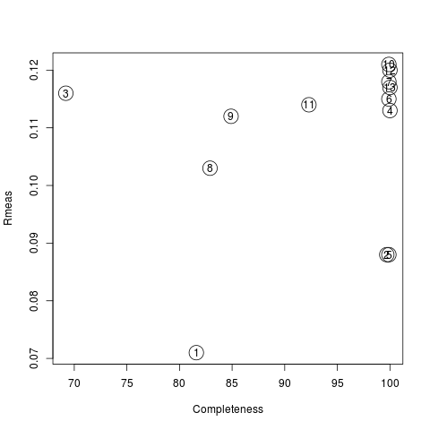 Values are sorted on increasing completeness, followed by lower Rmeas. Higher completeness is often associated with high redundancy (multiplicity), but also with poor isomorphism, because many more data sets are needed for both completeness and multiplicity to increase. For example, cluster 12 is 100% complete, as it is cluster 4, but this last cluster has lower Rmeas, quite certainly because it is the union of just two data sets, while cluster 12 includes nine data sets. A good result is represented by cluster 2, which has Rmeas = 0.088 and it is 99.7% complete. Cluster 5 is an even better choice; it has same Rmeas than cluster 2, but a much lower Rpim. It is a nearly complete set and has high multiplicity. This is what should probably be used. A visual version of the above table is provided by the “Rmeas_vs_Cmpl.png” or “Rmeas_vs_Cmpl.ps” plot: