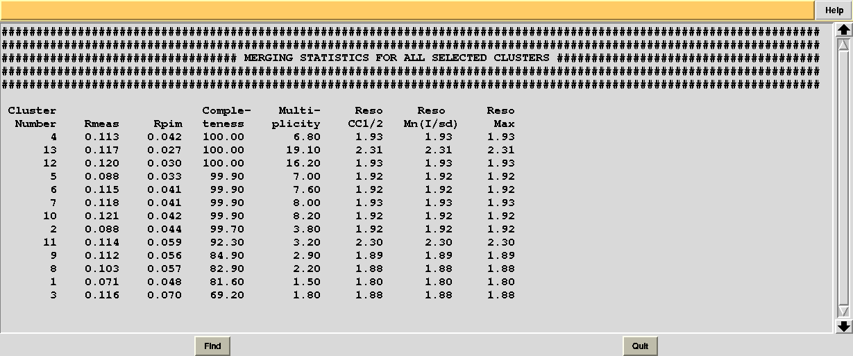 In this directory one can find unscaled (produced by POINTLESS) and scaled (produced by AIMLESS) files corresponding to all nodes selected in the dendrogram. Final overall merging statistics can be found in the “MERGING_STATISTICS.info” file: