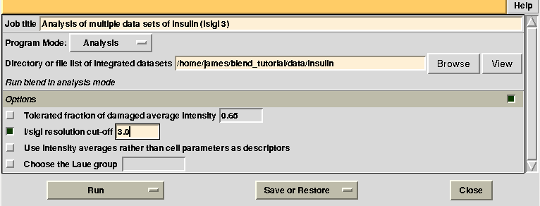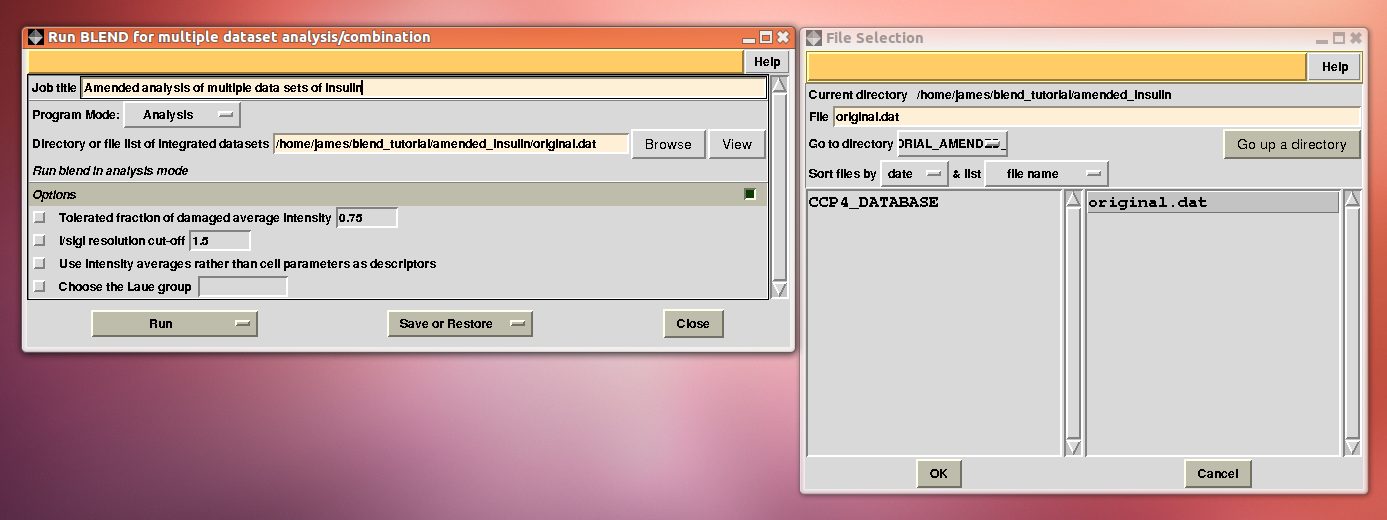Next, we associate this directory to a new project directory in ccp4i, called “BLEND_TUTORIAL_AMENDED_INSULIN”, and select this project directory. BLEND can now be executed again in analysis mode, this time selecting the “original.dat” file as starting point, rather than the whole directory containing all 14 insulin data sets: