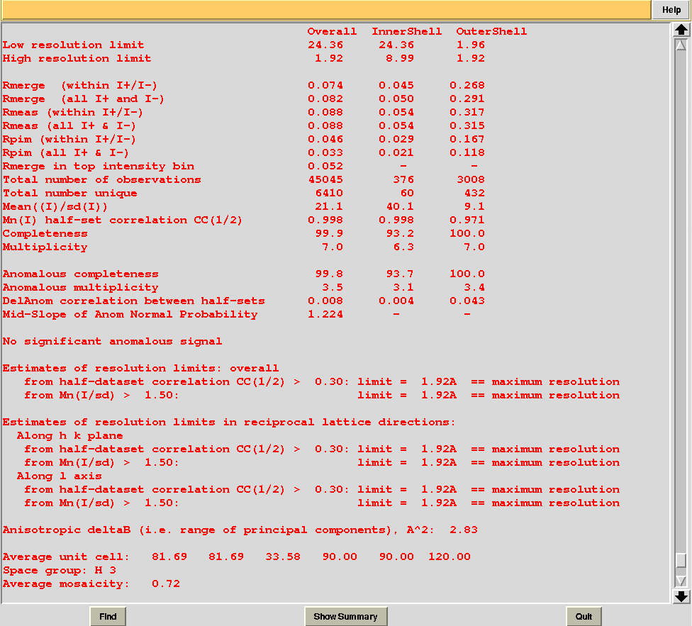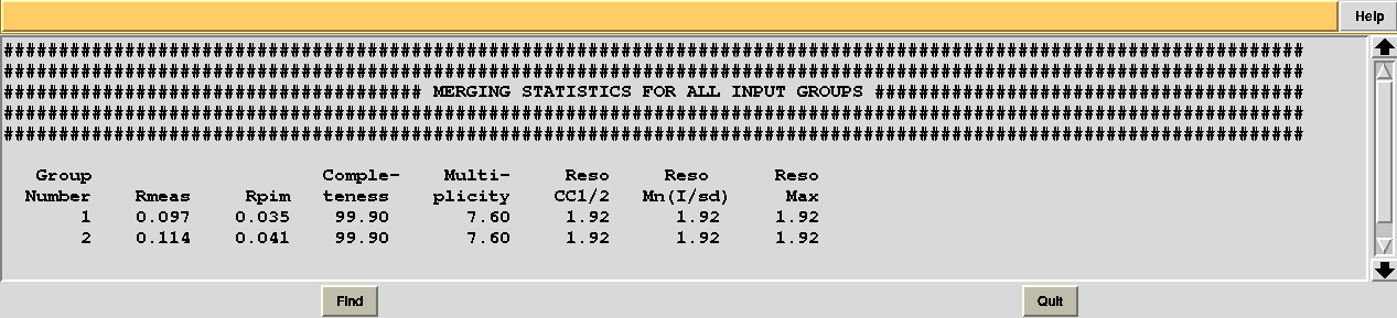 WARNING!!! All merging statistics included in this tutorial have been calculated using POINTLESS and AIMLESS. These CCP4 programs are periodically subject to small changes. It is therefore possible that some of the merging statistics contained in this tutorial appear slightly different from what the user obtains with his/her version of CCP4. These differences are very minimal and should be considered as primarily due to different numerical or algorithmical approximations.