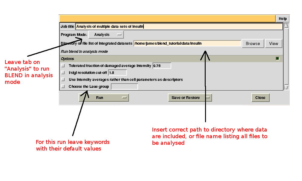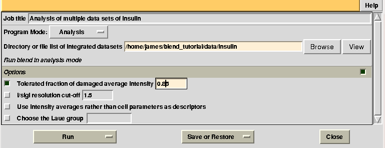 To begin with we run BLEND in analysis mode, with the main goal of creating clusters of data that can, potentially, merge well together. After having filled the blank fields with the appropriate paths and keywords, the above interface should resemble this: