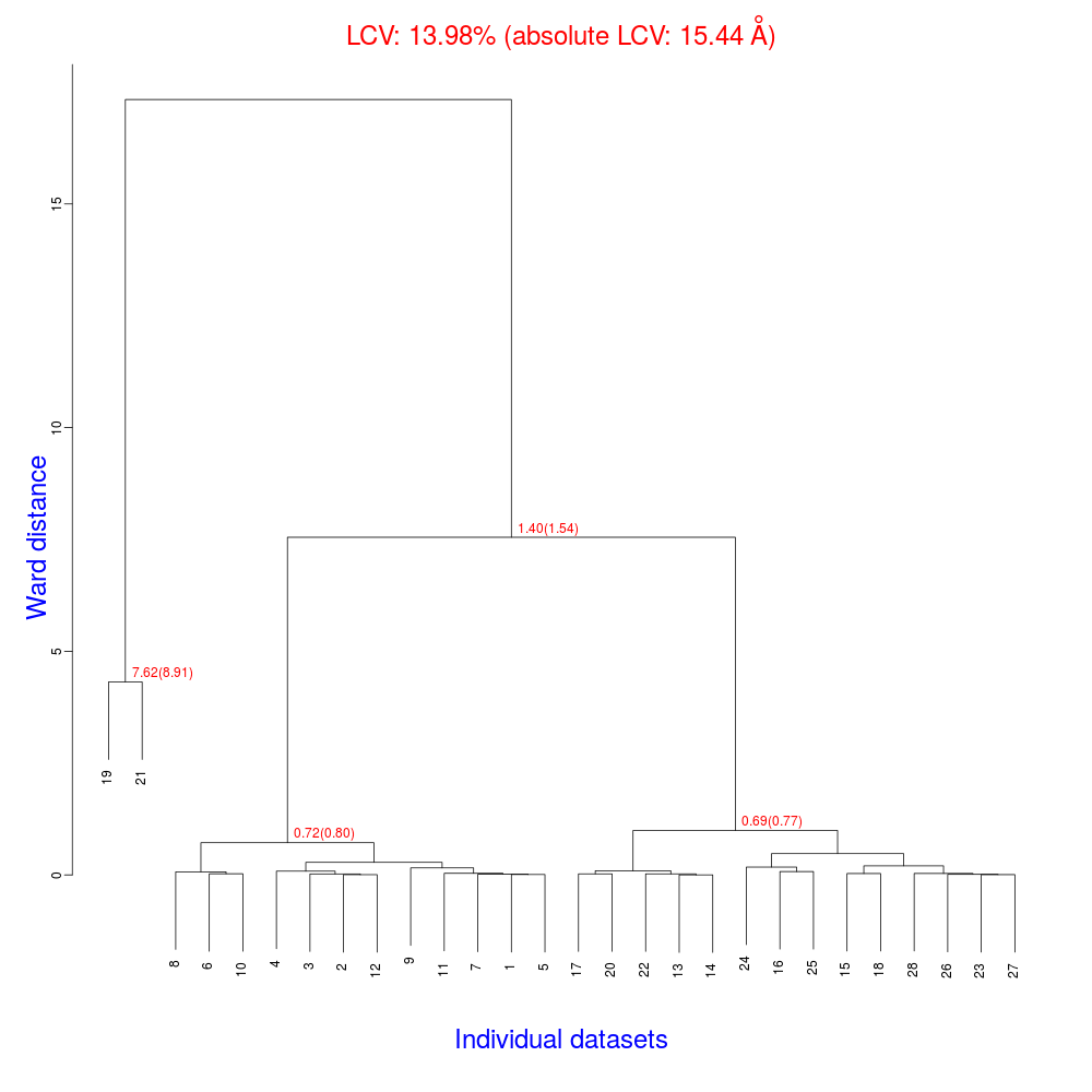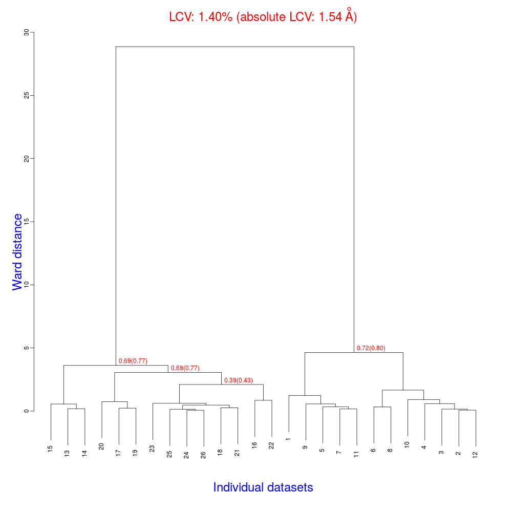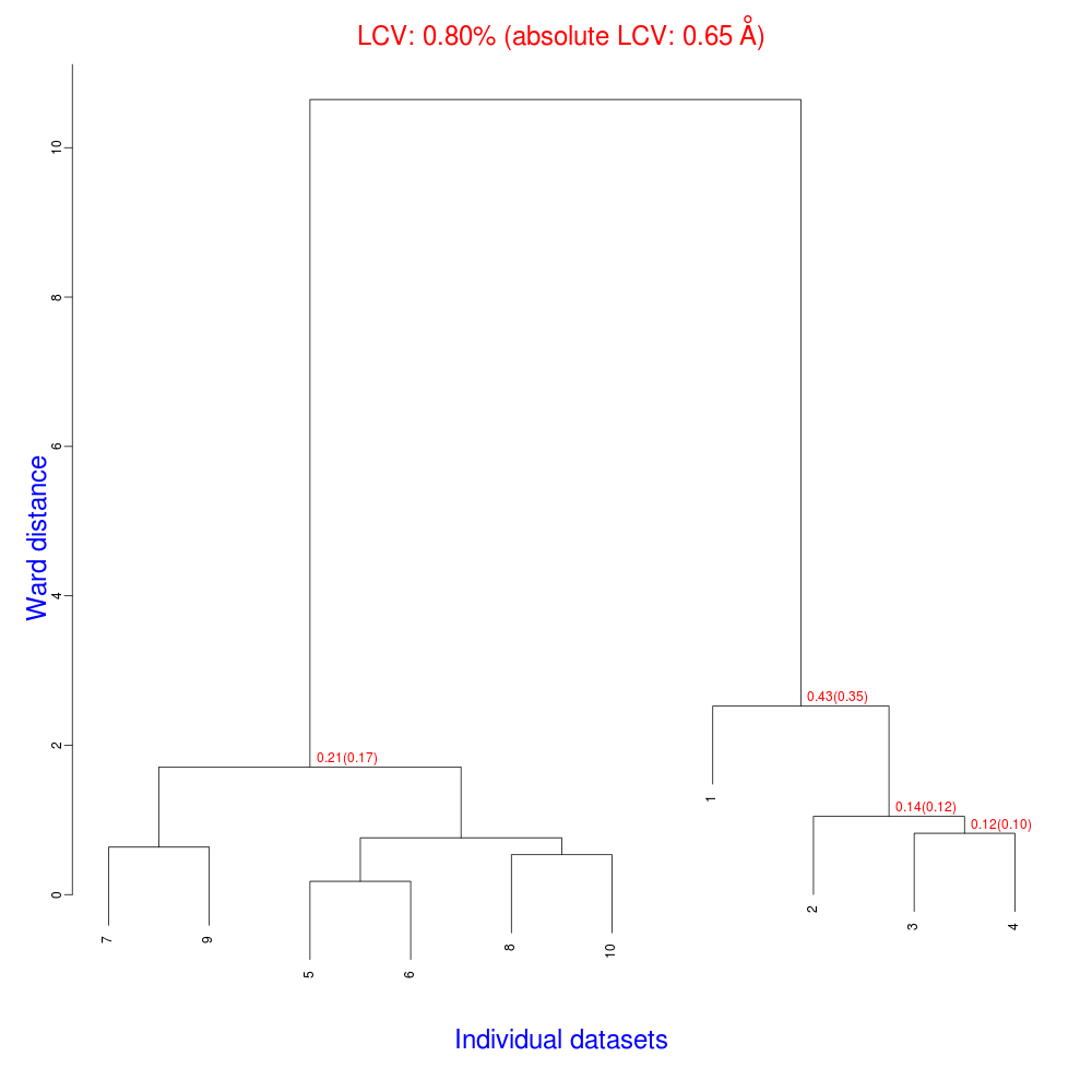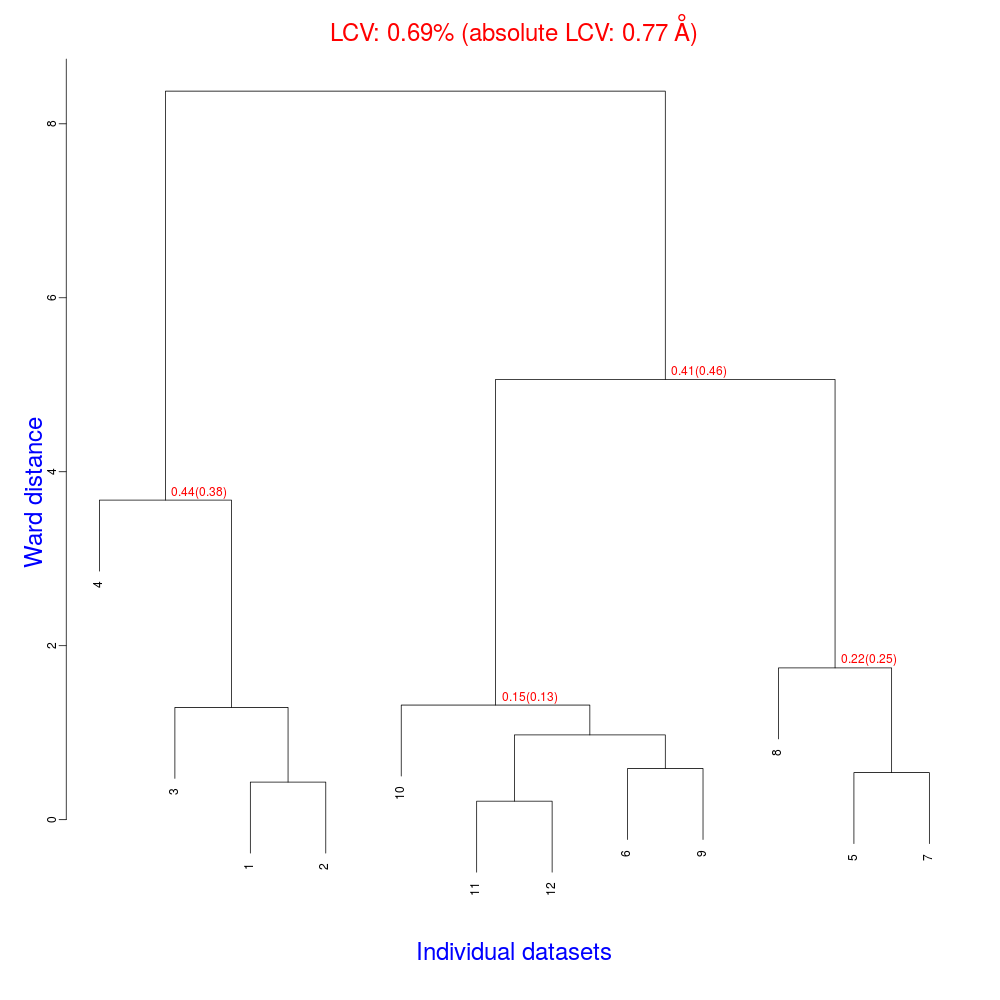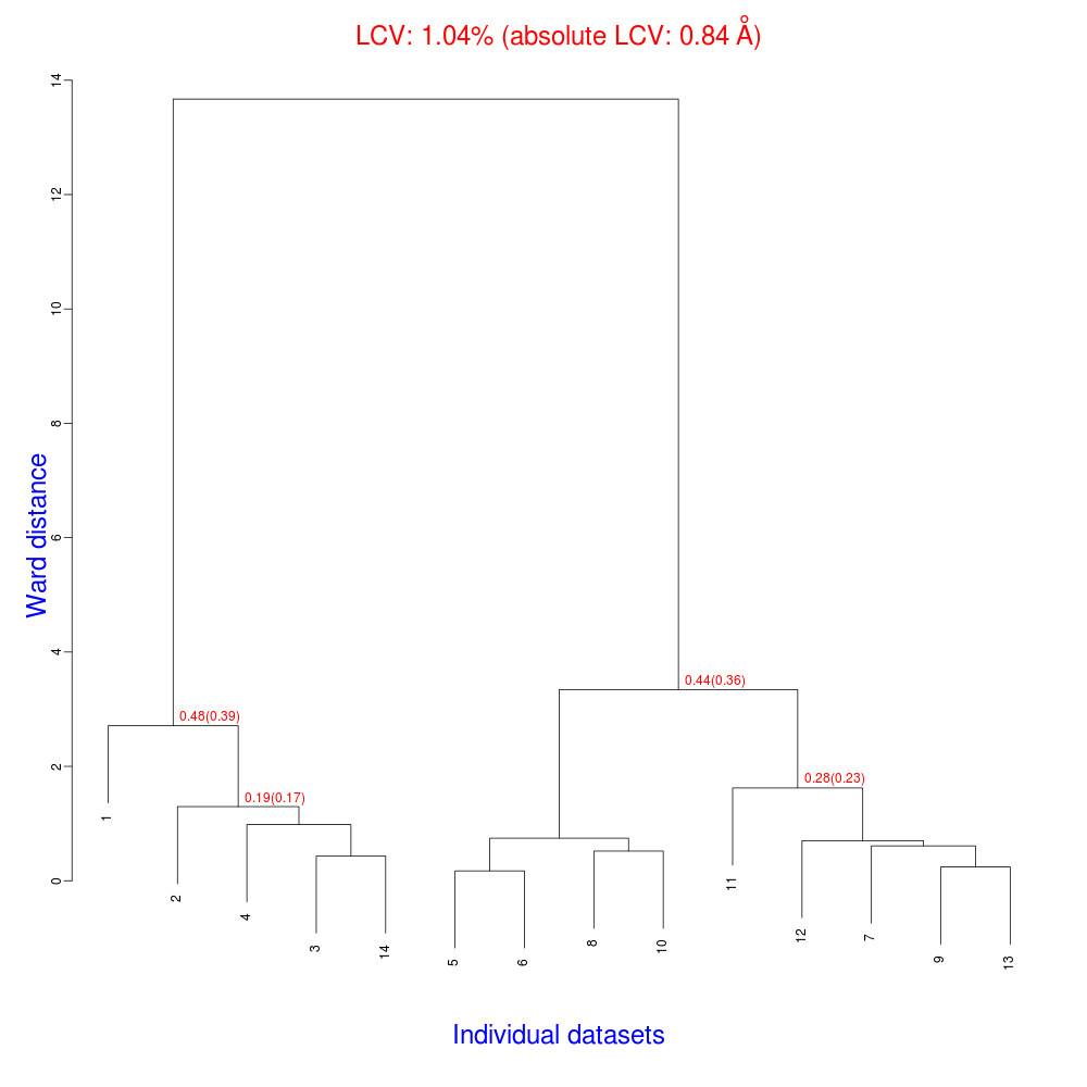 The numbers in red are the Linear Cell Variation (LCV) values (and the associated absolute LCV in Å) for the top five clusters. They give an indication of cell similarity among all crystals included in the specific cluster; thus, ultimately, they can be associated with isomorphism between different data sets. In the above dendrogram we can see two clusters with similar cell variability (0.44% and 0.48%, corresponding to 0.36 Å and 0.39 Å respectively).The variability is more than doubled when these clusters merge into the overall cluster containing all 14 data sets; this is probably an indication of some minor form of non-isomorphism. Tests done so far with BLEND show that some structural dissimilarities can be noticed for values of LCV higher than 1 – 1.5%. It is probably more appropriate to use absolute values in order to make judgments on crystals isomorphism. The reason is that the absolute Linear Cell Variation (aLCV) is expressed in angstroms and, thus, it can immediately give sensible numbers in relation to cell parameters differences.