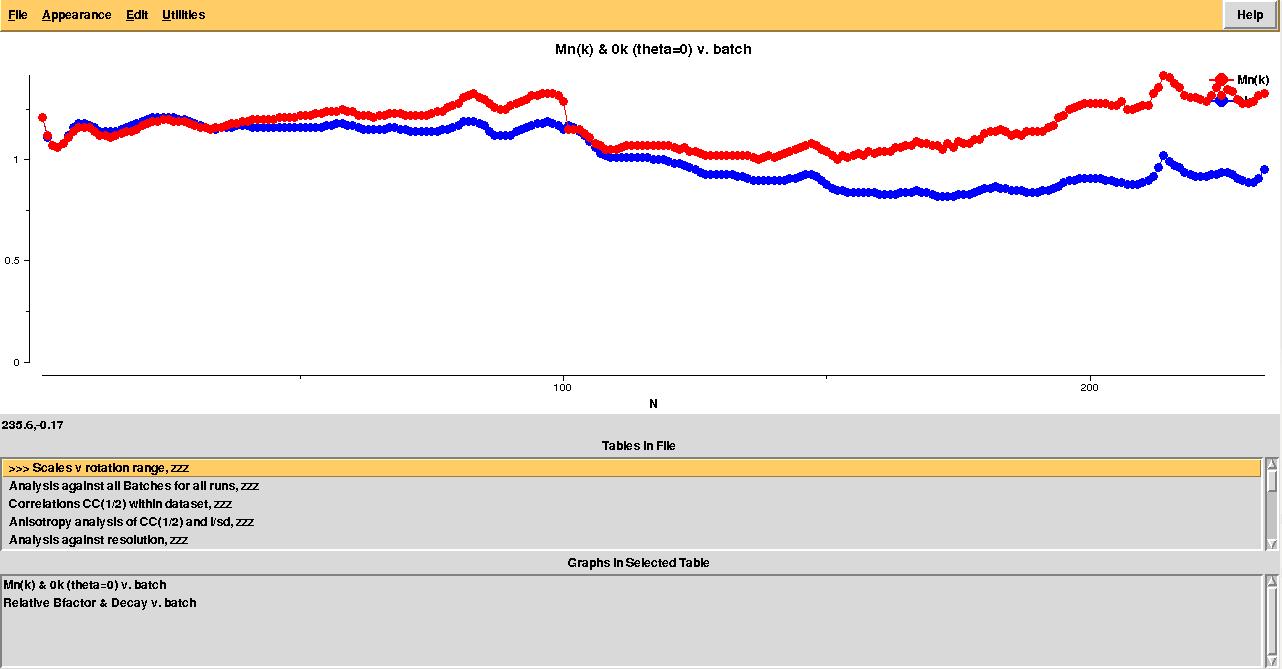 Images discarded are now less because we have allowed for intensities to be dampened, on average, by up to 35% of their starting value. A similar data exclusion can be applied in resolution terms, by changing value to the keyword ISIGI. For instance, let's re-run BLEND in analysis mode (with RADFRAC 0.75 - default value as the box "Tolerated fraction of damaged average intensity" is not selected), fixing ISIGI to 3:
