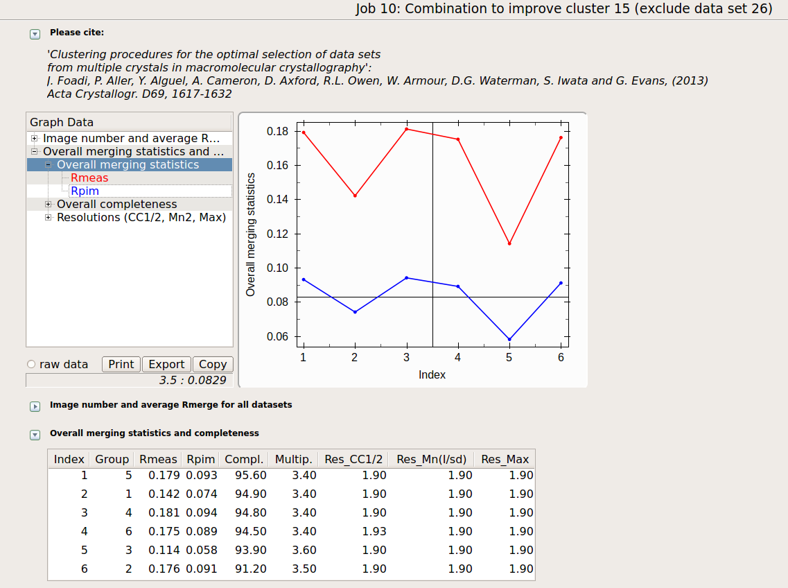 Check statistics under the new “merged_files” directory, they should have changed to include the desired resolution cutoff. "MERGING_STATISTICS.info" allows people to gain a better understanding of the ability individual data sets have to form larger, more complete and isomorphous groups. For example, in job number 5, it clearly emerges that cluster 5, composed of data sets 7, 9, 13, has good merging statistics and it is very complete. The two additional data sets joining 7, 9, 13 and forming cluster 10, i.e. data sets 11 and 12, make the situation worse, in terms of merging statistics.
