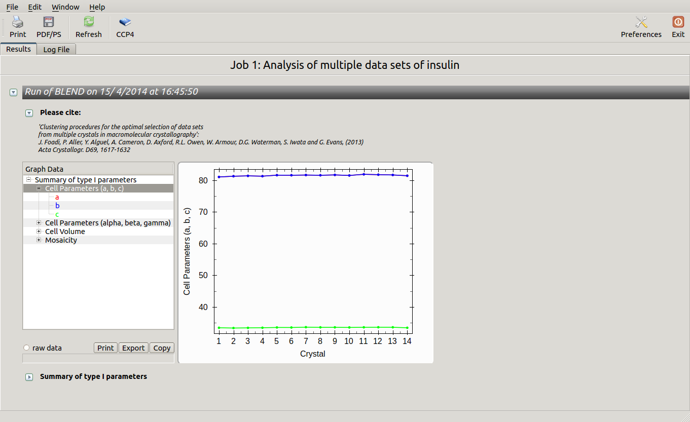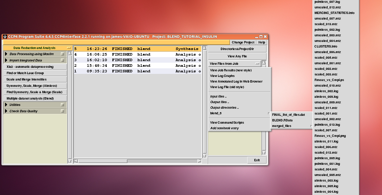 Cell sides, cell angles, cell volume and mosaicity can be viewed for all the 14 data sets included in this insulin tutorial. Numerical values can be explored within the same view. More files have been produced by this run of BLEND in analysis mode. These are listed by selecting “View Files from Job” → “blend_1”: