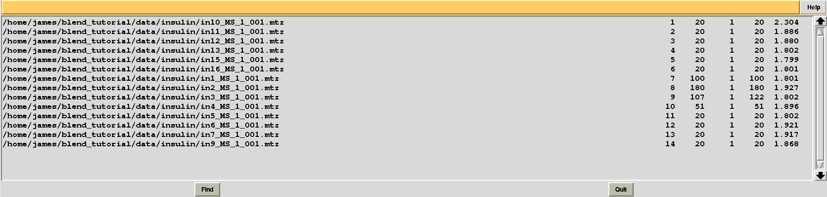 This is, essentially, a numerical version of the dendrogram and, as we will see, is often useful for executions of BLEND in synthesis mode. Another convenient file in directory “blend_1” is “BLEND_SUMMARY.txt”, which is essentially a table reporting cell parameters and other quantities for each data set. The unique serial number assigned by BLEND to each data set can be found in the “FINAL_list_of_files.dat” file. For us this file looks like the following: