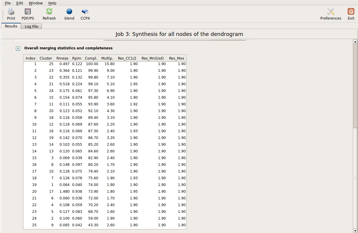 Both left (cluster 23) and right (cluster 24) branches of the dendrogram have relatively small aLCV values. This means that all crystals in each branch can be considered isomorphous. We can, then, delete some of the data sets in each branch so to bring Rmeas (or, even better, Rpim) down. As mentioned above, this is done using the option "-cF". In order to compare results with the cluster before the filtering we will also run BLEND in simple combination mode. Thus, for the left branch, we use: