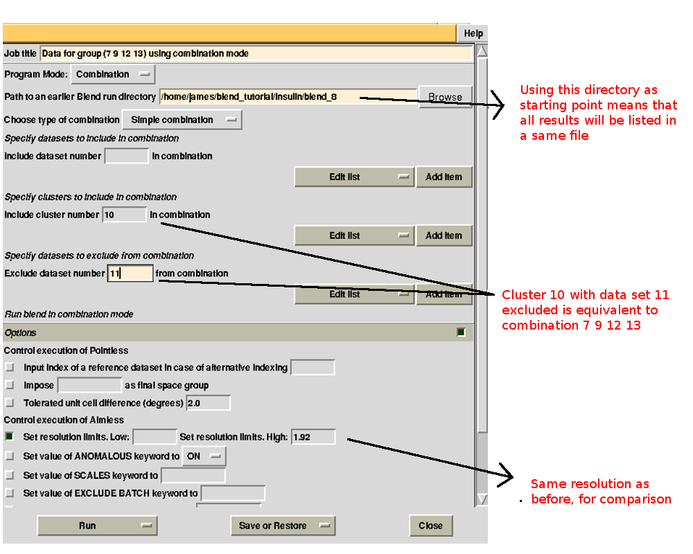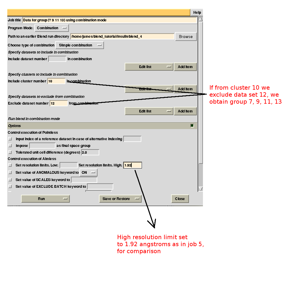It is possible to find out which data sets make the statistics worse by running BLEND in combination mode. For example, we might want to investigate whether data set 11 or data set 12 make statistics for cluster 5 worse. First we try with 11. The group formed by data sets 7, 9, 11 and 13 is equivalent to cluster 10 without data set 12. This can be specified in the graphical interface, to save typing time (this option becomes very useful when handling several data sets). As we would like to compare results with what has been computed for cluster 10 in BLEND job 5, we also fix the highest resolution to the same value used in that run, 1.92 Å: